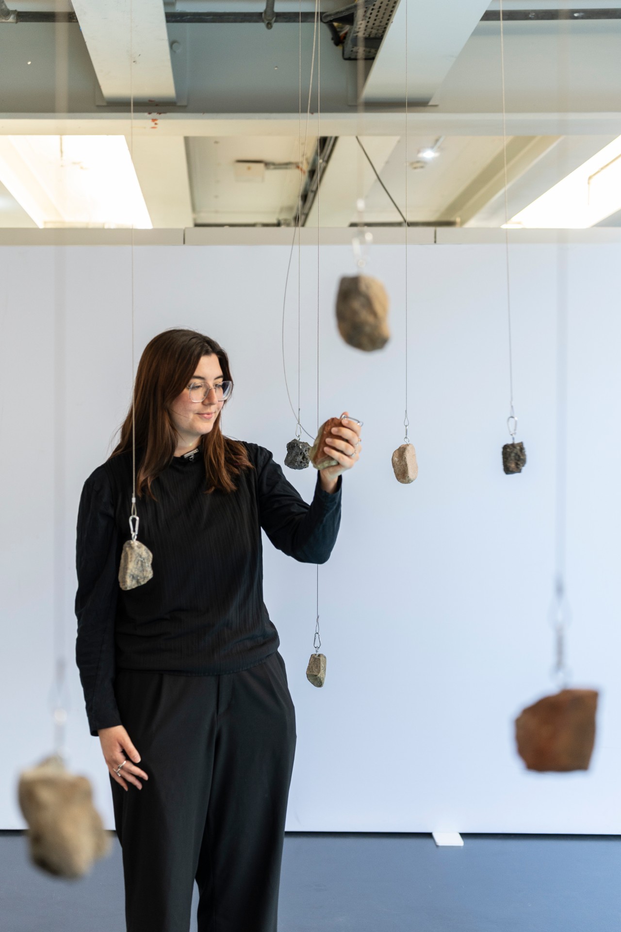 Um diese Grundthematik aufzugreifen, wurde ein Dialogsystem gestaltet, welches aus einem installativen und einem digitalen Teil besteht. Die Installation umfasst eine Aufhängung von der Decke, an denen Steine befestigt werden, die mehrere KI-bezogene Themen (z.B. Begriffe wie Vertrauenswürdigkeit) aufgreifen. Auf diesen »Grundbausteinen« sind diese Begriffe eingraviert und somit sichtbar für alle. Sobald ein Begriff durch UserInnen vorgelesen wird, startet ein Dialog mit der KI. Hier kommt der digitale Teil ins Spiel: Die KI stellt nun eine Frage, auf die geantwortet werden kann. So entwickelt sich ein individueller Dialog– ob ganz kurz, emotional oder lang. In Folge des Gesprächs formt sich auf einem Bildschirm der zum Gespräch zugehörige Dialog-Stein und ordnet sich systematisch in einer Übersicht über alle bereits geführten Gespräche und entstandenen Steine ein.