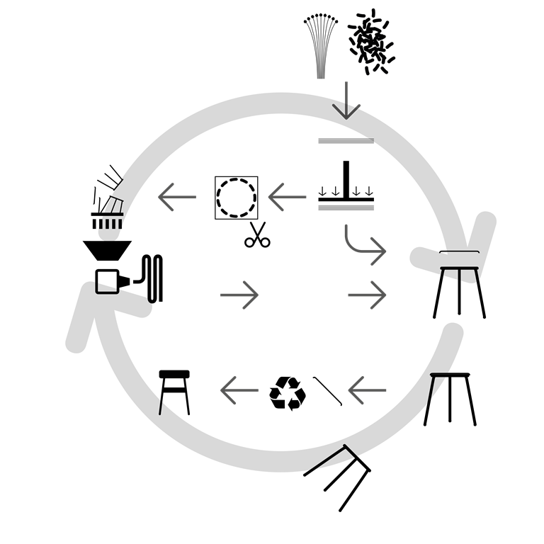 Ziel des Vorhabens war es, einen methodischen Ansatz zu entwickeln, so dass Aussagen zur Materialentwicklung bei Rezyklierprozessen von FVK (Faserverstärkten Kunststoffen) in Kombination mit Produktanforderungen getroffen werden können. Das Fraunhofer WKI hat diese Ansätze gemeinsam mit dem Designbüro Studio Jonathan Radetz an dem Modellmaterial eines Naturfaser-Kunststoff-Verbunds erarbeitet und in die Praxis übertragen.
